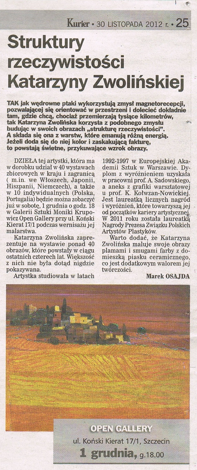 Ponad 40 obrazów i pasteli Katarzyny Zwolińskiej z okresu czterech ostatnich lat pracy artystycznej zaprezentowano w Open Gallery oraz w galerii Odra Zoo. Mecenat nad wystawą objęła firma EUROAFRICA Shipping Lines, która zainwestowała w obrazy Katarzyny Zwolińskiej podczas XIII Festiwalu Malarstwa Współczesnego w Szczecinie. Katarzyna Zwolińska od początku swojej kariery otrzymuje liczne nagrody i wyróżnienia. Zorganizowana w Szczecinie ekspozycja była największą wystawą w dotychczasowym dorobku artystki.